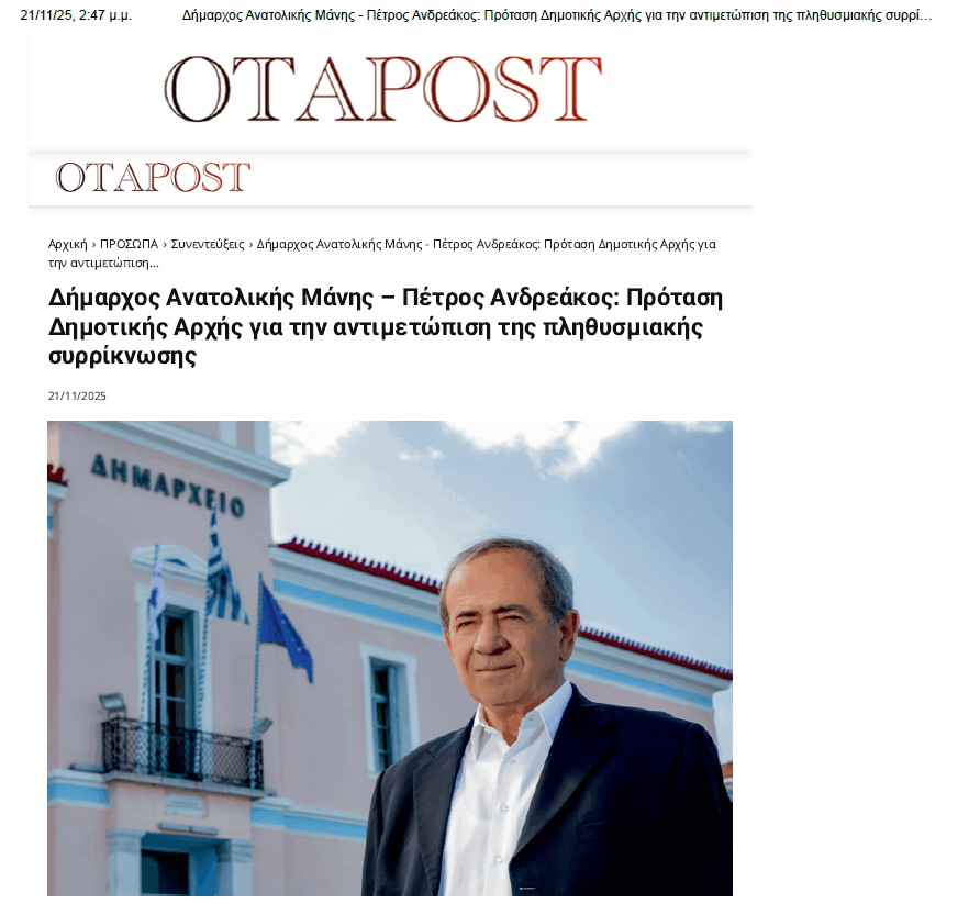 Ο Δήμαρχος Ανατολικής Μάνης, Πέτρος Ανδρεάκος, μιλά στην OTAPOST για την αντιμετώπιση του δημογραφικού και της ερήμωσης της υπαίθρου